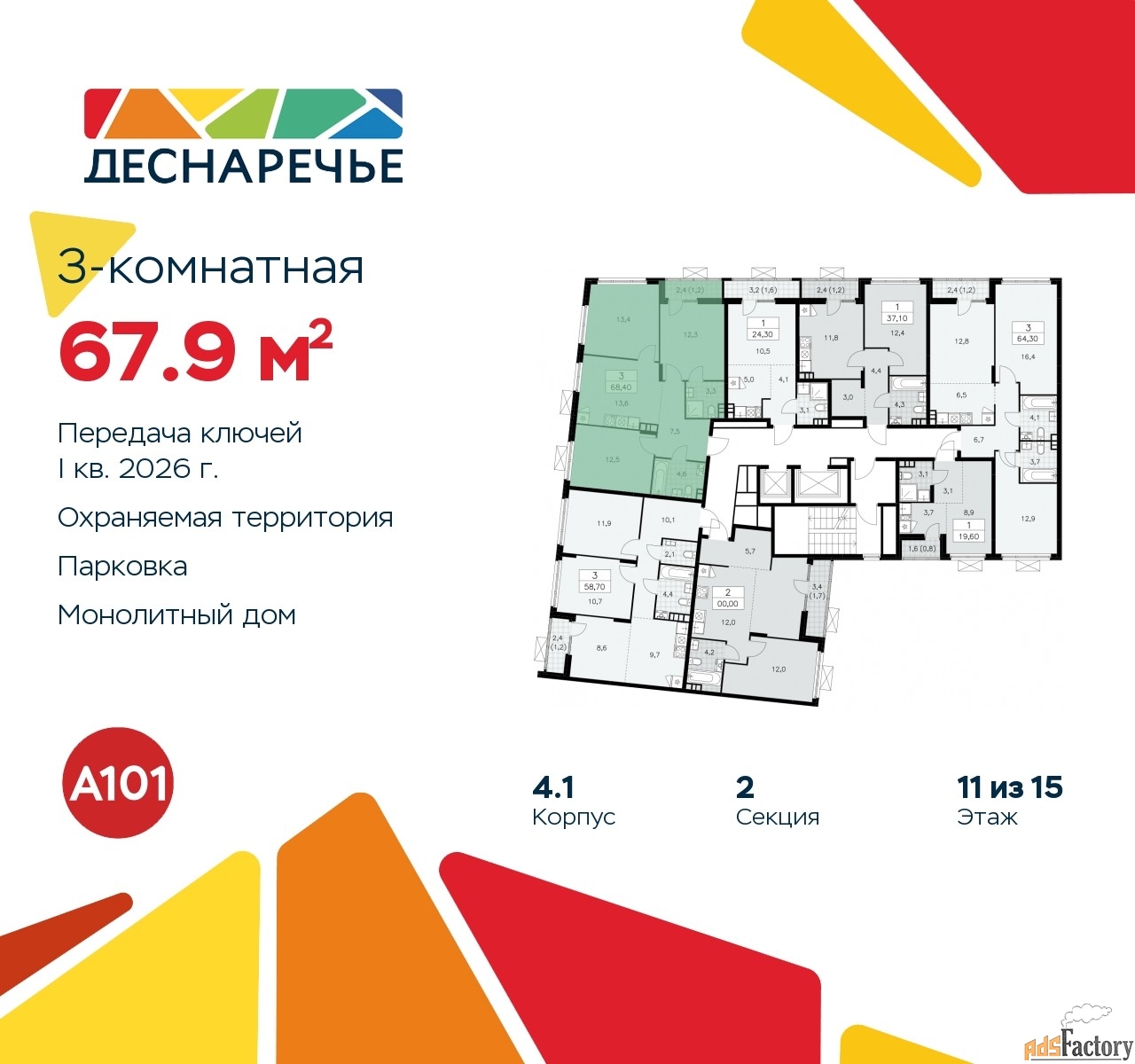 Дом монолитный, трехподъездный, высотой 15 этажей. Квартира находится во 2-й секции в корпусе 4.1. На этаже 7 квартир. В подъезде 1 пассажирский и 1 грузовой лифт. Начало строительства - 3 квартал 2023 года. Окончание строительства - 1 квартал 2026 года. Оформление сделки по договору долевого участия.