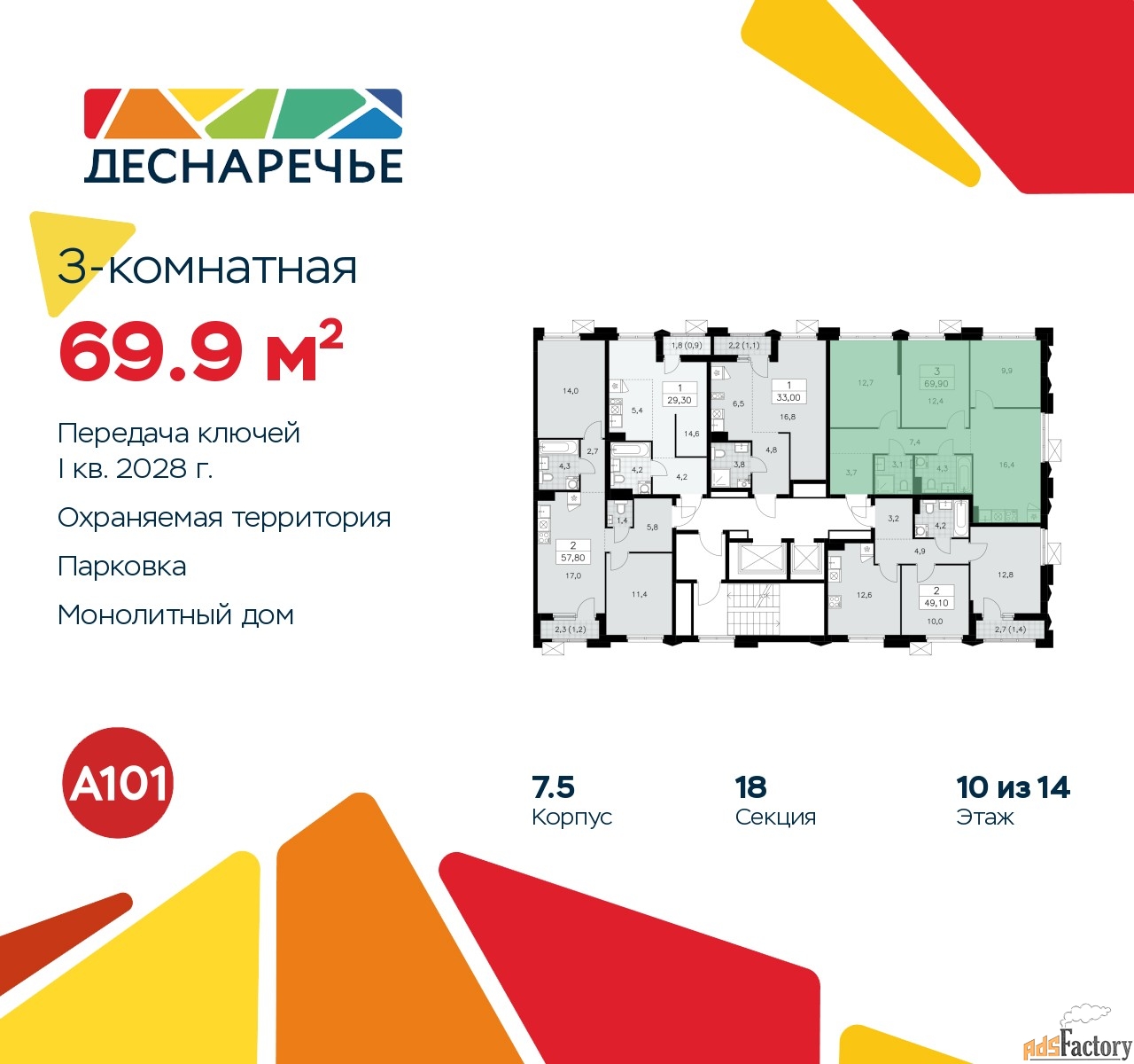 Дом монолитный, трехподъездный, переменной этажности, от 11 до 17 этажей. Квартира находится в 3-й секции высотой 14 этажей в корпусе 7.5. На этаже 5 квартир. В подъезде 1 пассажирский и 1 грузовой лифт. Начало строительства - 2 квартал 2025 года. Окончание строительства - 1 квартал 2028 года. Оформление сделки по договору долевого участия.