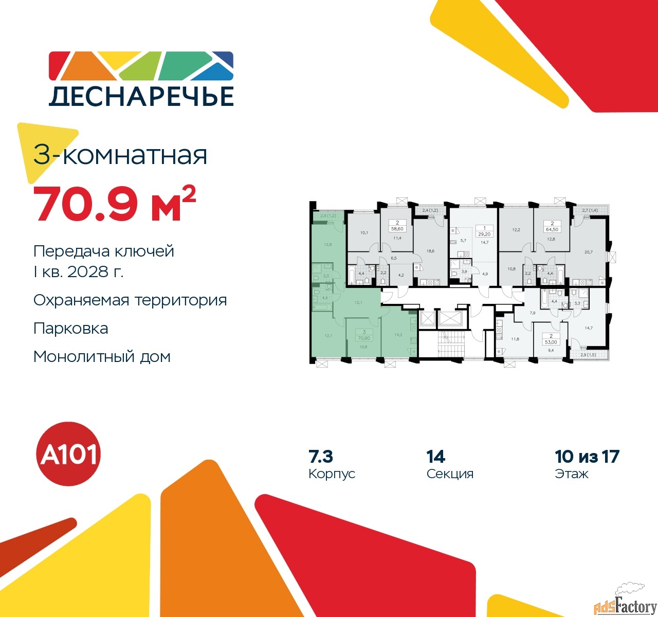 Дом монолитный, черырехподъездный, переменной этажности, от 9 до 17 этажей. Квартира находится в 4-й секции высотой 16 этажей в корпусе 7.3. На этаже 5 квартир. В подъезде 1 пассажирский и 1 грузовой лифт. Начало строительства - 2 квартал 2025 года. Окончание строительства - 1 квартал 2028 года. Оформление сделки по договору долевого участия.