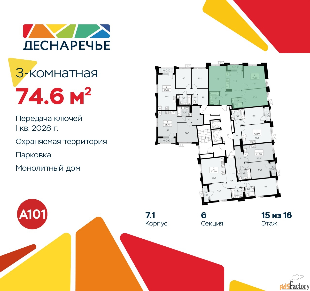 Дом монолитный, многоподъездный, переменной этажности, от 8 до 16 этажей. Квартира находится в 6-й секции высотой 16 этажей в корпусе 7.1. На этаже 6 квартир. В подъезде 1 пассажирский и 1 грузовой лифт. Начало строительства - 2 квартал 2025 года. Окончание строительства - 1 квартал 2028 года. Оформление сделки по договору долевого участия.