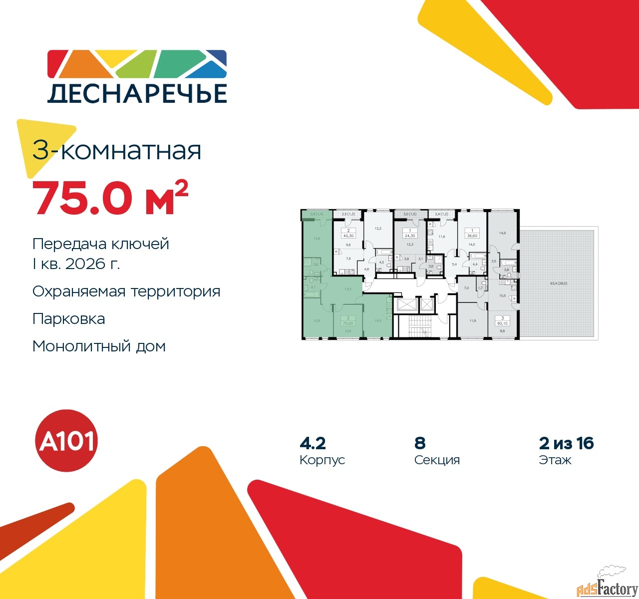 Дом монолитный, многоподъездный, переменной этажности, от 7 до 16 этажей. Квартира находится в 5-й секции высотой 12 этажей в корпусе 4.2. На этаже 5 квартир. В подъезде 1 пассажирский и 1 грузовой лифт. Начало строительства - 3 квартал 2023 года. Окончание строительства - 1 квартал 2026 года. Оформление сделки по договору долевого участия.