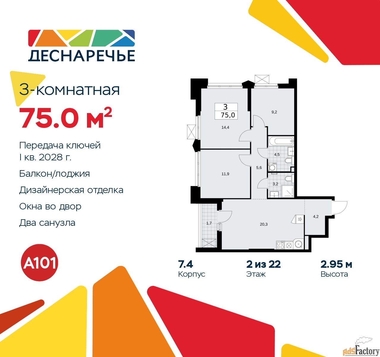 Квартира находится в корпусе 7.4. Дом монолитный, одноподъездный, высотой 22 этажа. На этаже 9 квартир. В подъезде 1 пассажирский и 2 грузовых лифта. Начало строительства - 2 квартал 2025 года. Окончание строительства - 1 квартал 2028 года. Оформление сделки по договору долевого участия.