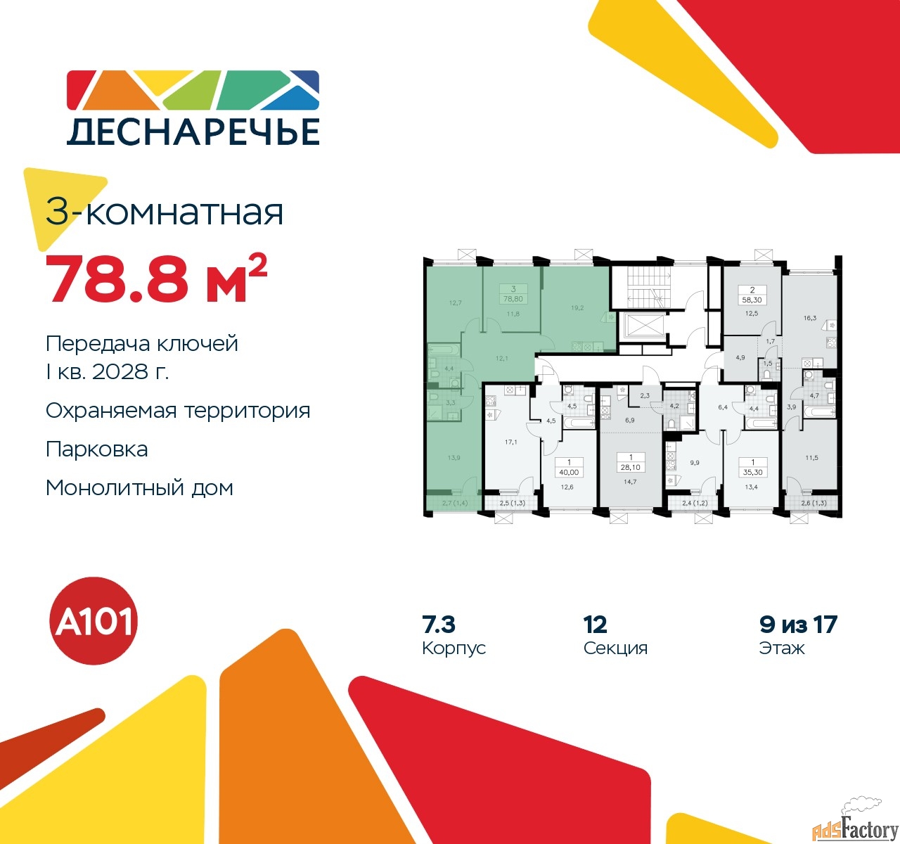 Дом монолитный, черырехподъездный, переменной этажности, от 9 до 17 этажей. Квартира находится во 2-й секции высотой 9 этажей в корпусе 7.3. На этаже 5 квартир. В подъезде 1 пассажирский и 1 грузовой лифт. Начало строительства - 2 квартал 2025 года. Окончание строительства - 1 квартал 2028 года. Оформление сделки по договору долевого участия.