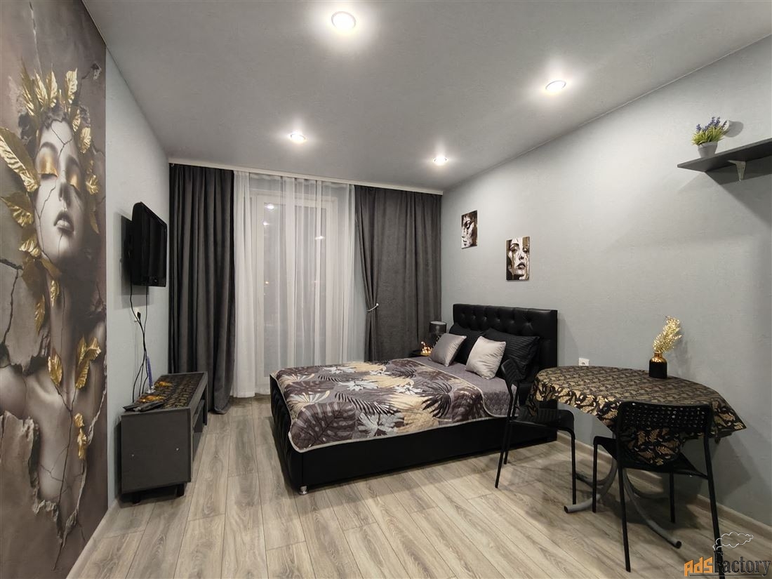 В квартире двуспальная кровать, кухонный гарнитур с электроплитой и вытяжкой ,где имеется вся необходимая посуда и принадлежности, электрический чайник,микроволновая печь,кофеварка для лучшего начала дня.