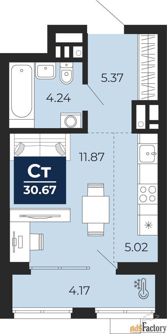 Просторная 1-комн. квартира-студия с предчистовой отделкой в ЖК «Соната Парк» на 2 этаже. Общая площадь: 28.59 кв.м., площадь гостиной 16.89 кв.м., из которых 5.02 кв.м. выделено под кухонную зону. Все окна выходят на одну сторону. В квартире один балкон, один совмещенный санузел. Высота потолков 2.72 м.
