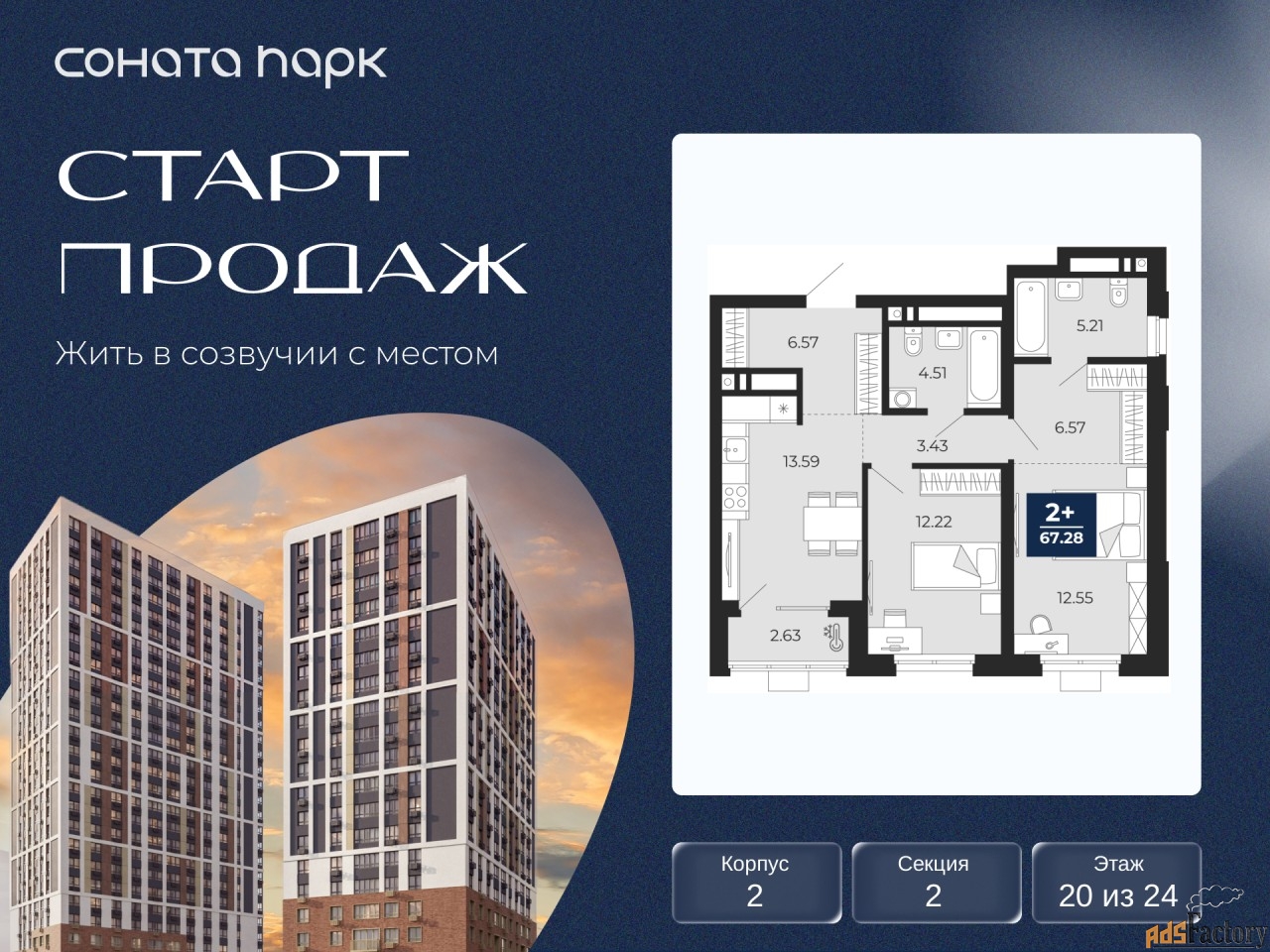 Дом монолитный, трехподъездный, переменной этажности, от 10 до 24 этажей. Квартира находится во 2-й секции высотой 24 этажа в корпусе 2. На этаже 10 квартир. В подъезде 2 пассажирских и 1 грузовой лифт. Окончание строительства - 4 квартал 2028 года. Оформление сделки по договору долевого участия.