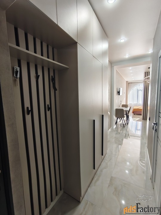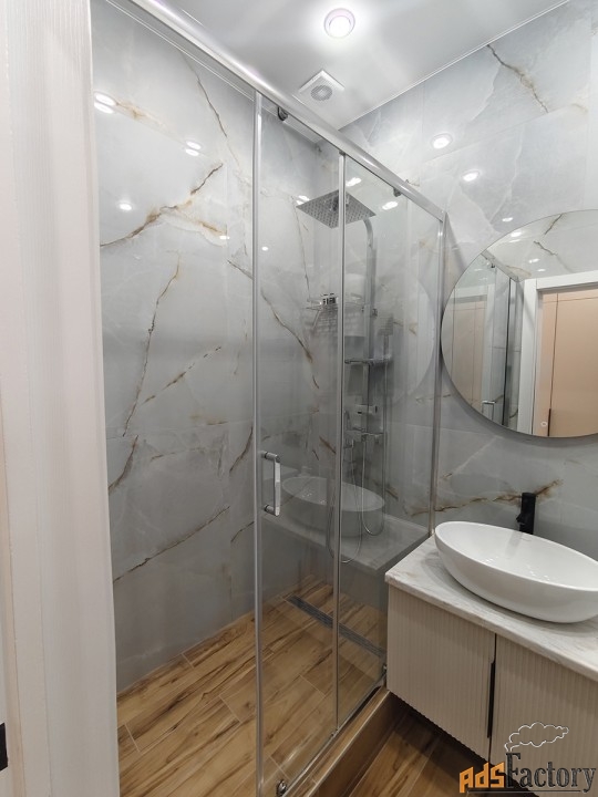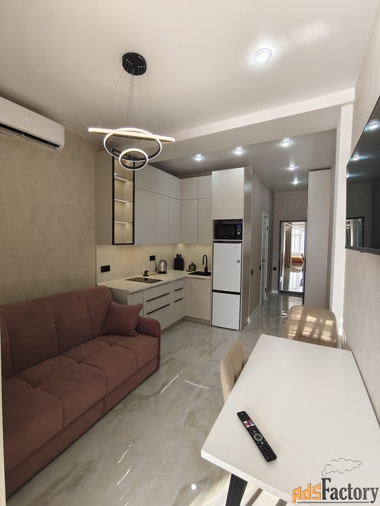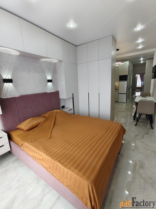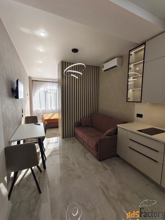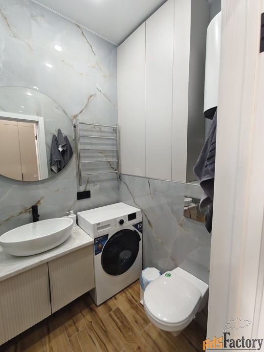 Панорамные арочные окна, тюль, шторы, инверторная сплит-система зима/лето, телевизор смарт, интернет, холодильник с морозильной камерой, микроволновая печь, чайник, индукционная плита, гладильная доска, утюг, сушилка для белья, посуда, столовые приборы, постельные принадлежности, вытяжка (санузел + кухонная зона), душевая кабина, фен для волос, бойлер, плитка керамогранит, инсталляция с подвесным унитазом, вместительная стиральная машина автомат на 6 кг., полотенца, полотенцесушитель, ванные принадлежности, проходные выключатели, полная освещённость.