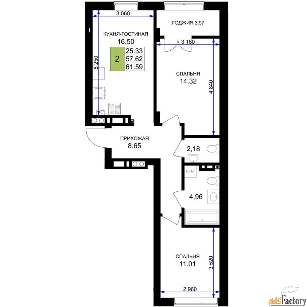 Жилая площадь 25.33 м2, кухня 16.5 м2, предчистовая отделка.