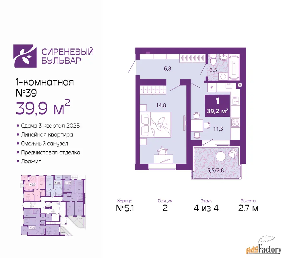Дом монолитный, многоподъездный, высотой 4 этажа. Квартира находится во 2-й секции в корпусе 5.1. На этаже 6 квартир. В подъезде 1 грузовой лифт. На сегодняшний день строительство завершено, дом сдан в 4 квартале 2025 года. Оформление сделки по договору купли-продажи.