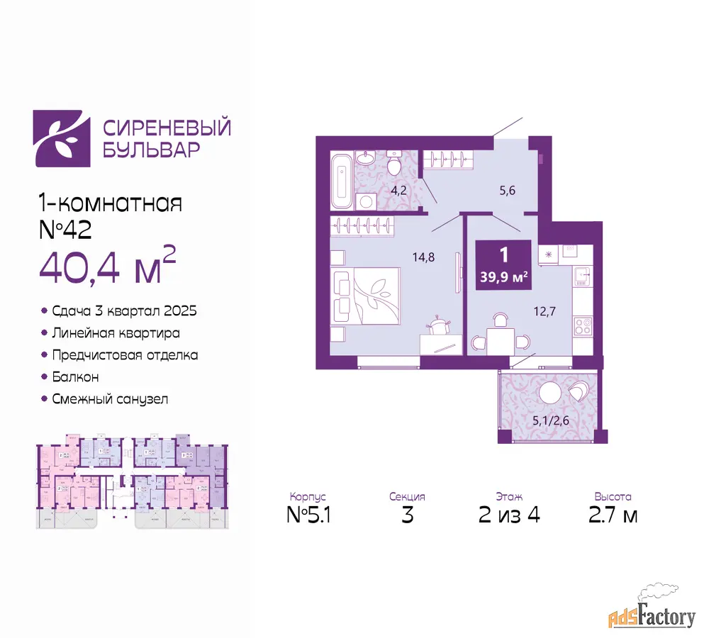 Дом монолитный, многоподъездный, высотой 4 этажа. Квартира находится в 3-й секции в корпусе 5.1. На этаже 4 квартиры. В подъезде 1 грузовой лифт. На сегодняшний день строительство окончено, дом сдан в 4 квартале 2025 года. Оформление сделки по договору купли-продажи.