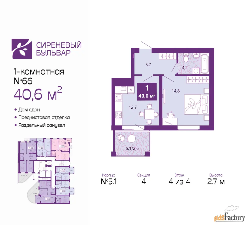 Дом монолитный, многоподъездный, высотой 4 этажа. Квартира находится в 4-й секции в корпусе 5.1. На этаже 4 квартиры. В подъезде 1 грузовой лифт. В настоящее время строительство завершено, дом сдан в 4 квартале 2025 года. Оформление сделки по договору купли-продажи.