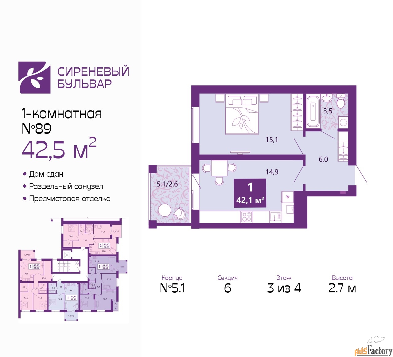 Дом монолитный, многоподъездный, высотой 4 этажа. Квартира находится в 6-й секции в корпусе 5.1. На этаже 4 квартиры. В подъезде 1 грузовой лифт. Строительство окончено, дом сдан в 4 квартале 2025 года. Оформление сделки по договору купли-продажи.