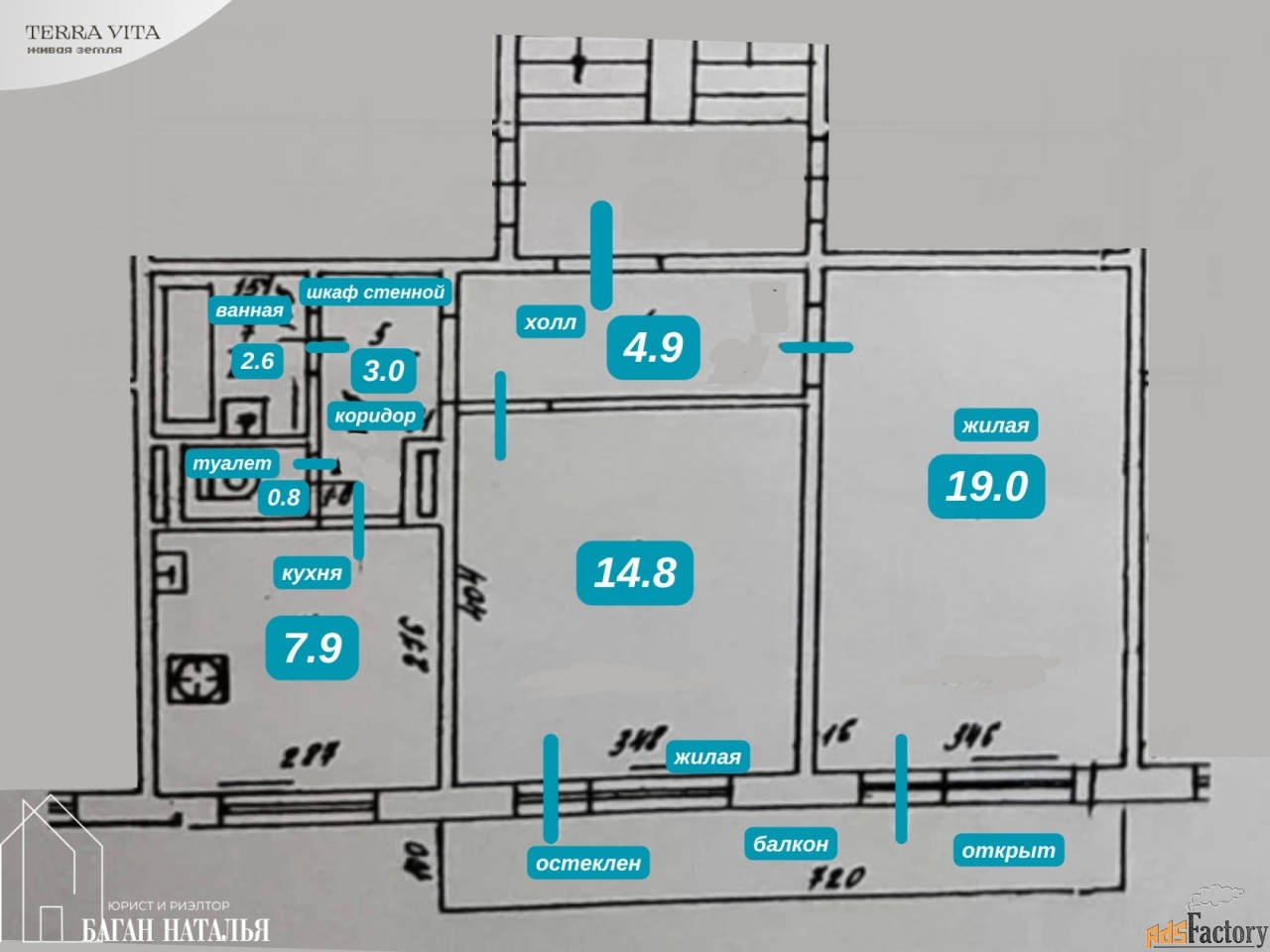 • Общая площадь: 52.8 м2 (без учета балкона 10.1 м2)