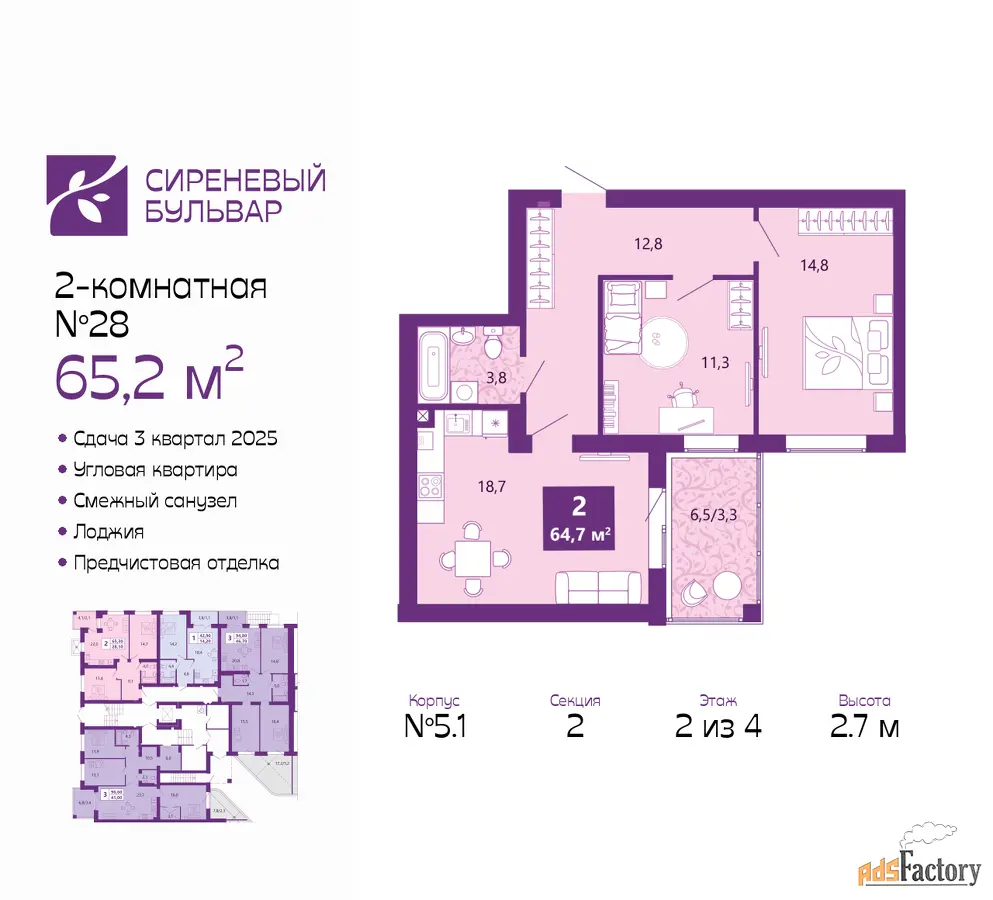 Дом монолитный, многоподъездный, высотой 4 этажа. Квартира находится во 2-й секции в корпусе 5.1. На этаже 6 квартир. В подъезде 1 грузовой лифт. Строительство завершено, дом сдан в 4 квартале 2025 года. Оформление сделки по договору купли-продажи.