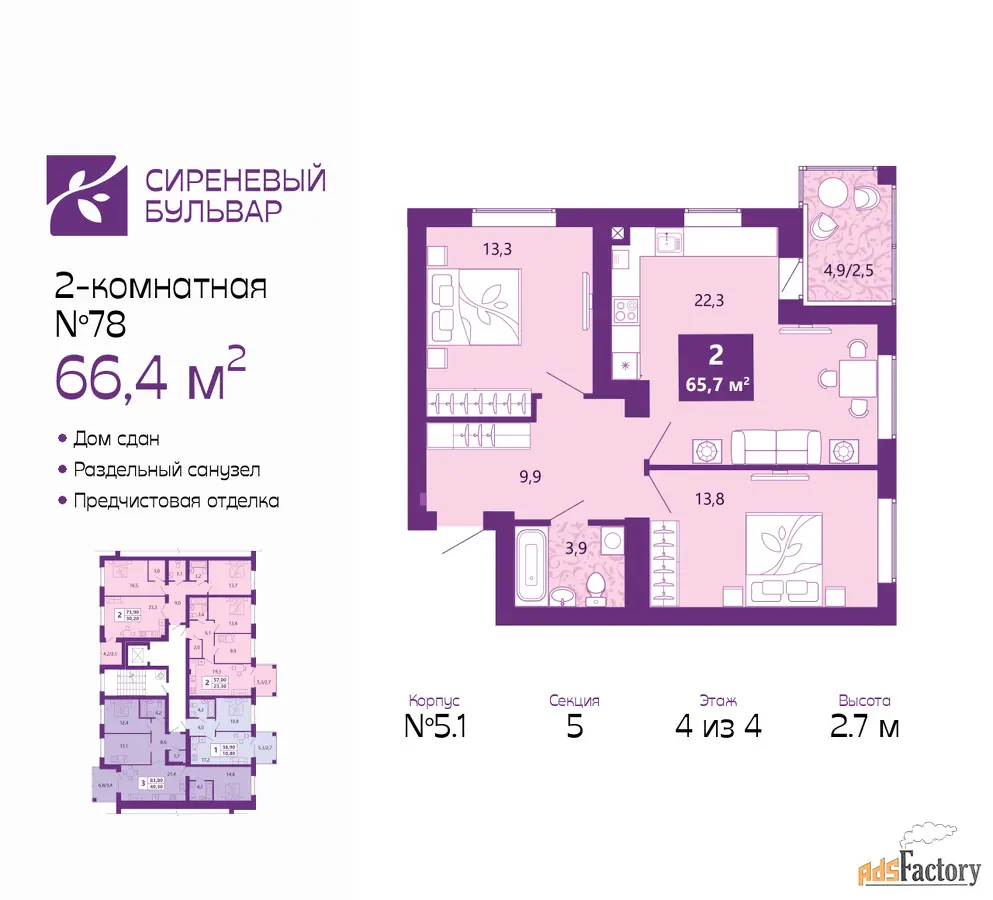Дом монолитный, многоподъездный, высотой 4 этажа. Квартира находится в 5-й секции в корпусе 5.1. На этаже 5 квартир. В подъезде 1 грузовой лифт. В настоящее время строительство окончено, дом сдан в 4 квартале 2025 года. Оформление сделки по договору купли-продажи.