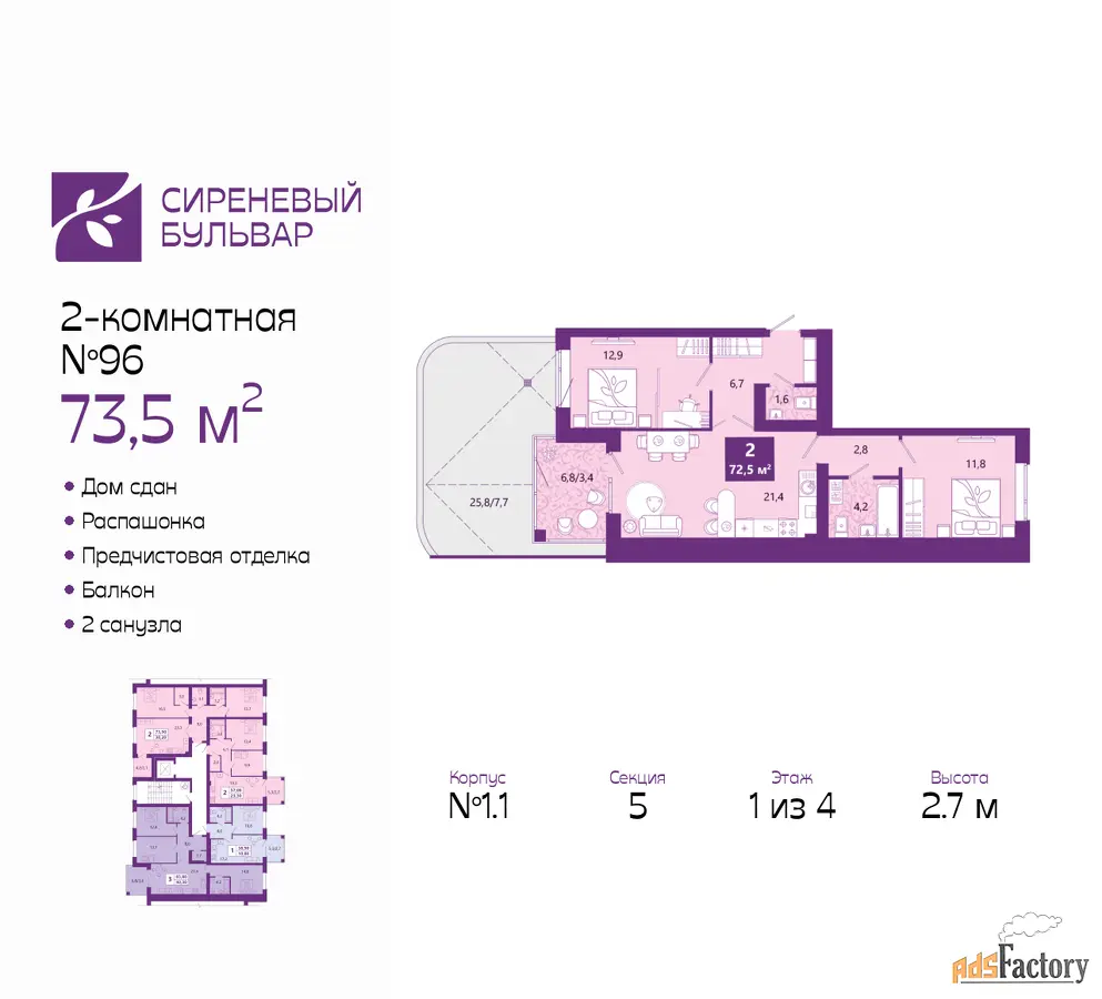Жилой комплекс «Сиреневый бульвар» это 5 клубных 4-х этажных домов на 16 квартир и 9 домов с несколькими секциями. Вместе эти дома формируют собственное закрытое пространство с дворовыми территориями, спортивными и детскими площадками, местами отдыха и коммерческими помещениями. Дизайнерские входные группы и небольшие приусадебные участки квартир нижних этажей, обилие зелени, удобные зоны отдыха – всё устроено с особым вниманием.