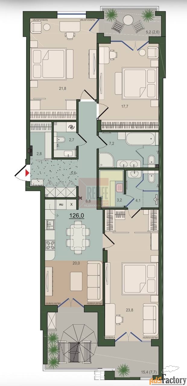 Арт. 127405269 <br>Продается эксклюзивная 3 комнатная квартира в жилом комплексе комфорт класса «Адрес Счастья» Квартира расположена на 7 этаже 9-ти этажного дома. <br> <br>Общая площадь квартиры 126 кв.м. Планировка квартиры функциональна и продумана до мелочей, что обеспечивает достойное и комфортное проживание. Просторная кухня-гостиная площадью 20 кв.м. с выходом на террасу. Три комнаты 23,8+21,8+17,7 кв.м. с выходом на террасы. Два совмещенных санузла и гостевой санузел. Баня! Высота потолков 3 метра. Автономное отопление регулируется компактным теплопунктом в квартире, установлена система теплый пол. Дом сдан. <br> <br>Жилой комплекс «Адрес Счастья» - новый уровень комфорта в сфере массовой жилой застройки. Энергосберегающее панорамное остекление открывает живописные виды и создает солнечное настроение. Благоустройство придомовой территории разработано в соответствии с концепцией «двор без машин», что обеспечивает безопасность жителей. <br> <br>Для удобства жителей комплекса предусмотрено всё: гостевой и подземный паркинг, сеть велодорожек с двусторонним движением, колясочные, велопарковки и общественный туалет. <br>Изюминка благоустройства внутреннего двора - универсальная спортивная площадка для активных видов спорта, спроектированная таким образом, чтобы обеспечить естественное дневное освещение для подземного паркинга. <br> <br>Крыши домов стали зонами отдыха на открытом воздухе, где можно заниматься спортом и йогой. <br>Развитая инфраструктура жилого квартала: рестораны, кафе, салоны красоты, магазины, детские школы искусств, аптеки, детская и взрослая поликлиники, торговый центр, детские сады, школа, фитнес-залы. <br> <br>Есть возможность приобрести два парковочных места рядом со входом в подъезд. <br> <br>Удобная транспортная развязка: до Рыбной деревни и Кафедрального собора-7 минут; до аэропорта Храброво - 18 минут; до побережья Балтийского моря - 22 минуты. <br>Будем рады поделиться с вами еще более подробной и развернутой информацией по телефону или же в рамках личной встречи. Обращайтесь к нам в любое время!