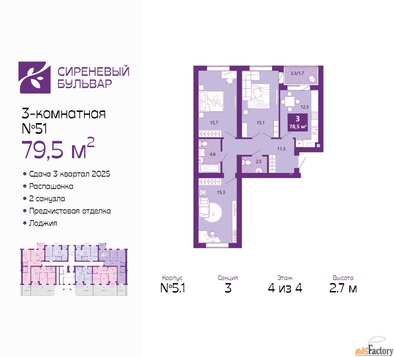 Дом монолитный, многоподъездный, высотой 4 этажа. Квартира находится в 3-й секции в корпусе 5.1. На этаже 4 квартиры. В подъезде 1 грузовой лифт. Дом сдан. Оформление сделки по договору купли-продажи.