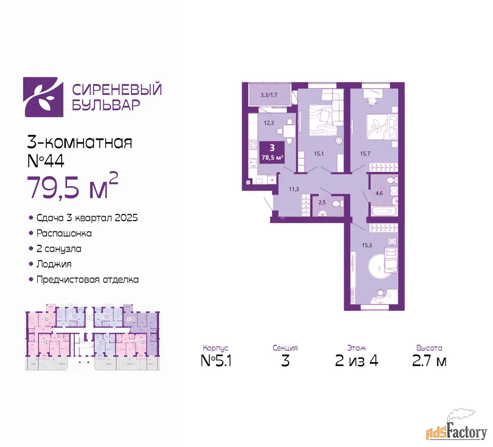 Дом монолитный, многоподъездный, высотой 4 этажа. Квартира находится в 3-й секции в корпусе 5.1. На этаже 4 квартиры. В подъезде 1 грузовой лифт. Строительство окончено, дом сдан в 4 квартале 2025 года. Оформление сделки по договору купли-продажи.