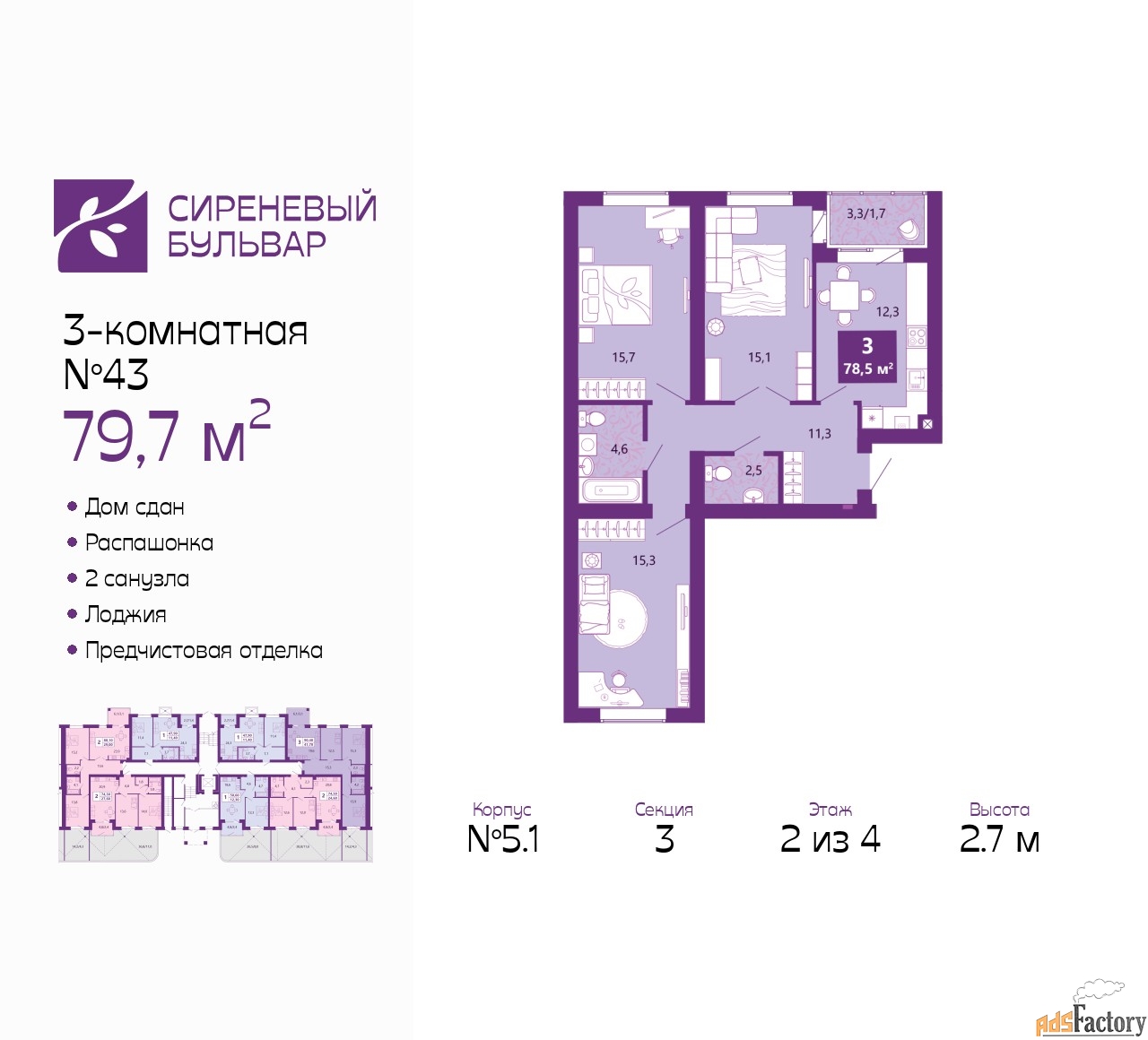 Дом монолитный, многоподъездный, высотой 4 этажа. Квартира находится в 3-й секции в корпусе 5.1. На этаже 4 квартиры. В подъезде 1 грузовой лифт. В настоящее время строительство завершено, дом сдан в 4 квартале 2025 года. Оформление сделки по договору купли-продажи.