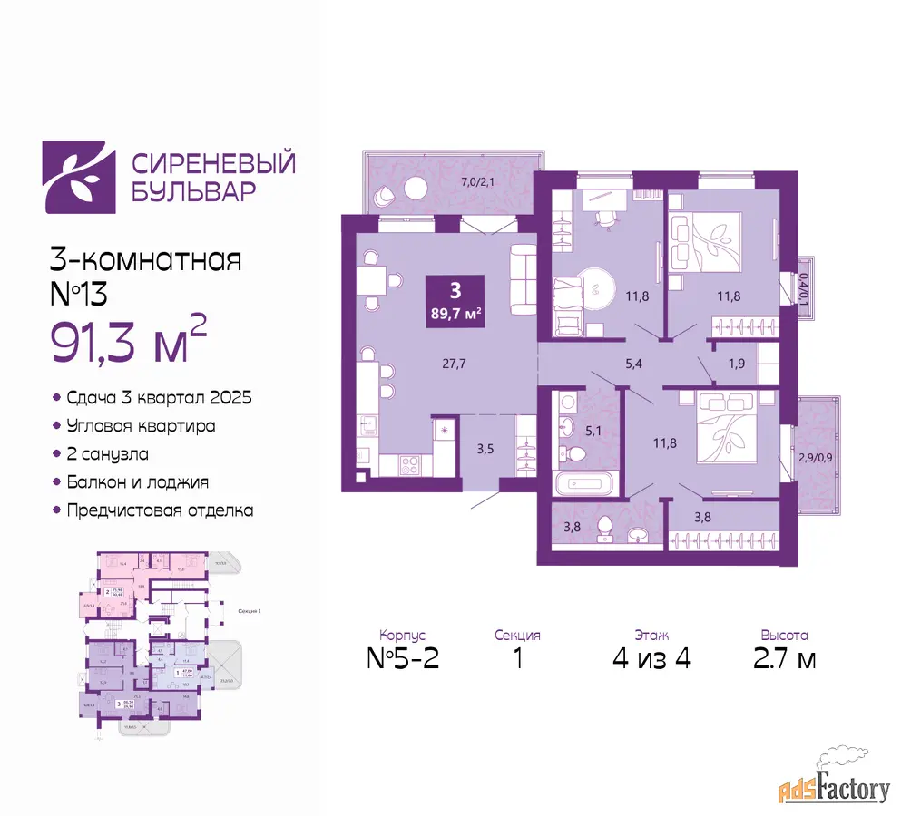 | Высота потолков (м.) | 2.7 |