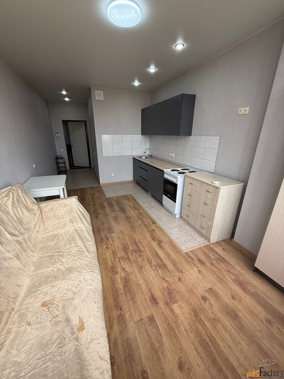В квартире сделан качественный евроремонт. Пространство студии продумано до мелочей: жилая площадь составляет 18 кв. м, а кухня — 5 кв. м, что удобно для приготовления и приема пищи. Санузел совмещенный, современный и функциональный. В квартире есть все необходимое для комфортного проживания, включая современную мебель и технику.
