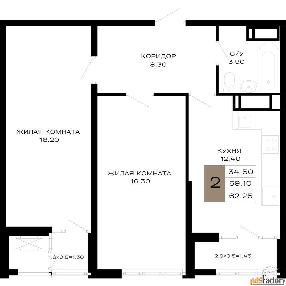 Жилая площадь 35.05 м2, кухня 12.41 м2, предчистовая отделка.