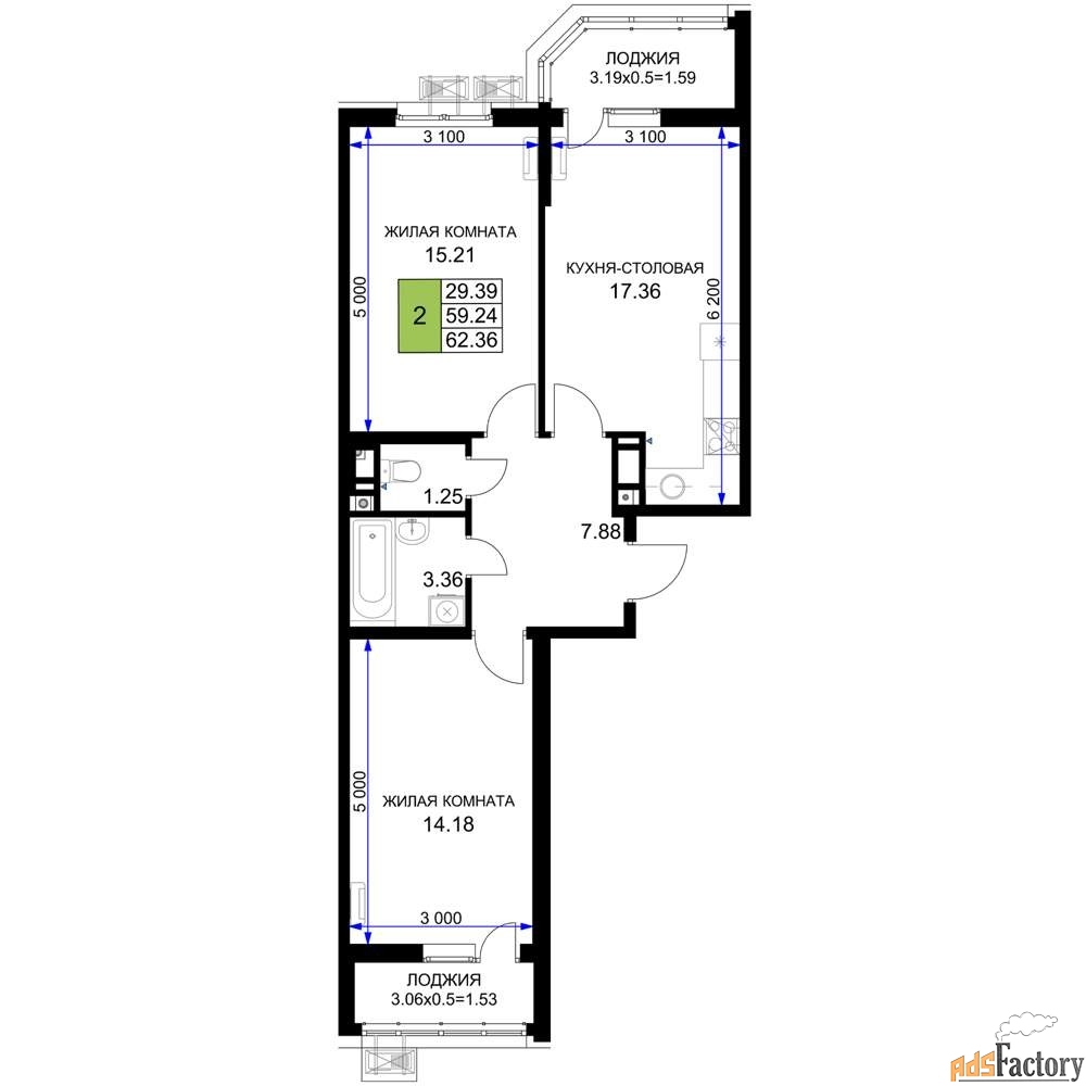 Жилая площадь 29.39 м2, кухня 17.36 м2, предчистовая отделка.