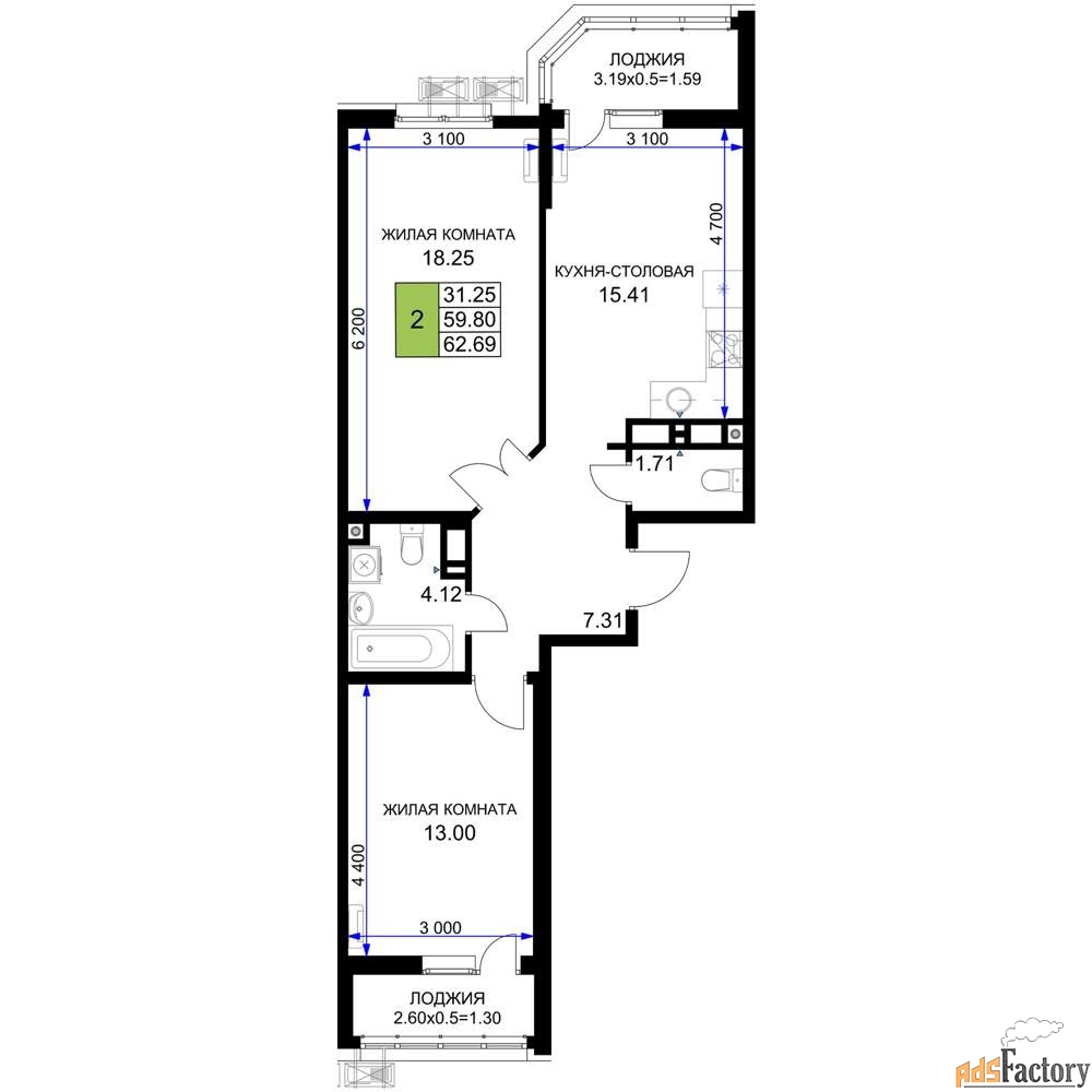 Жилая площадь 31.25 м2, кухня 15.41 м2, предчистовая отделка.