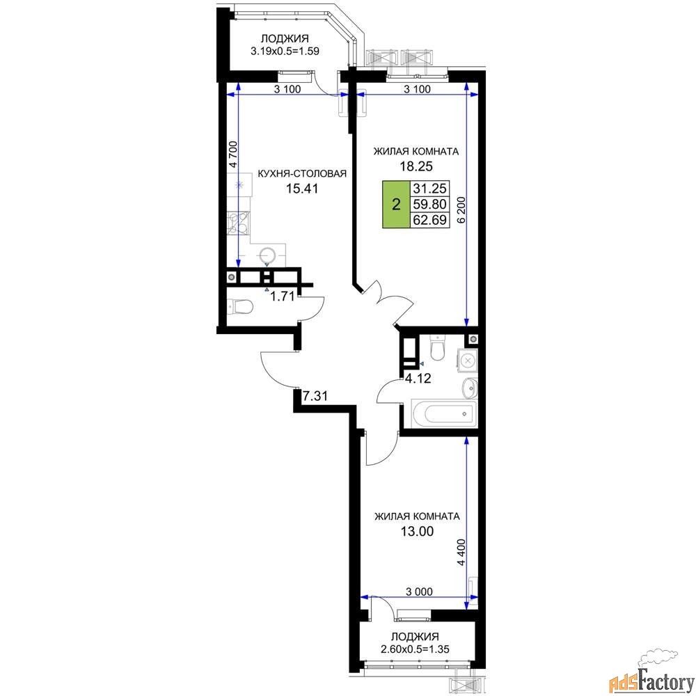Жилая площадь 31.25 м2, кухня 15.41 м2, предчистовая отделка.