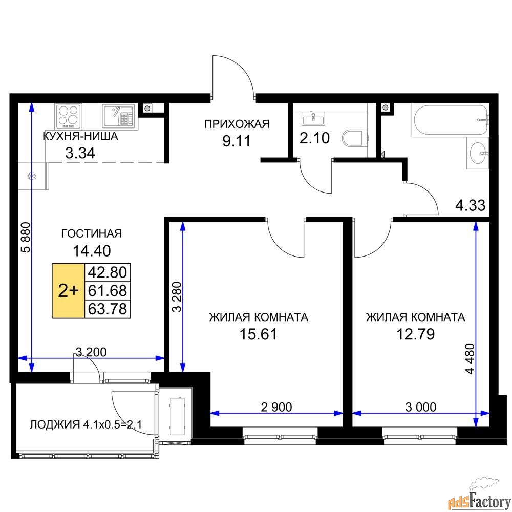 Жилая площадь 42.8 м2, кухня 17.74 м2, предчистовая отделка.