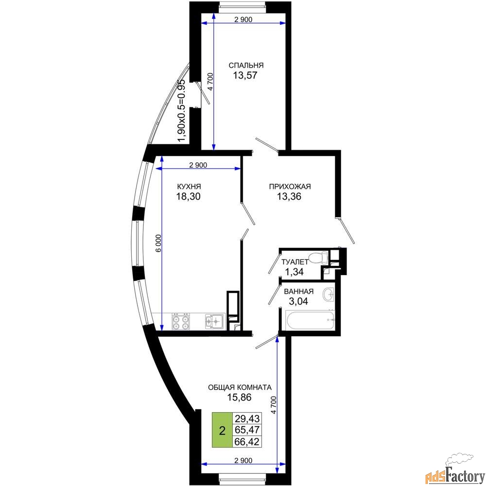 Жилая площадь 29.43 м2, кухня 9.89 м2, предчистовая отделка.