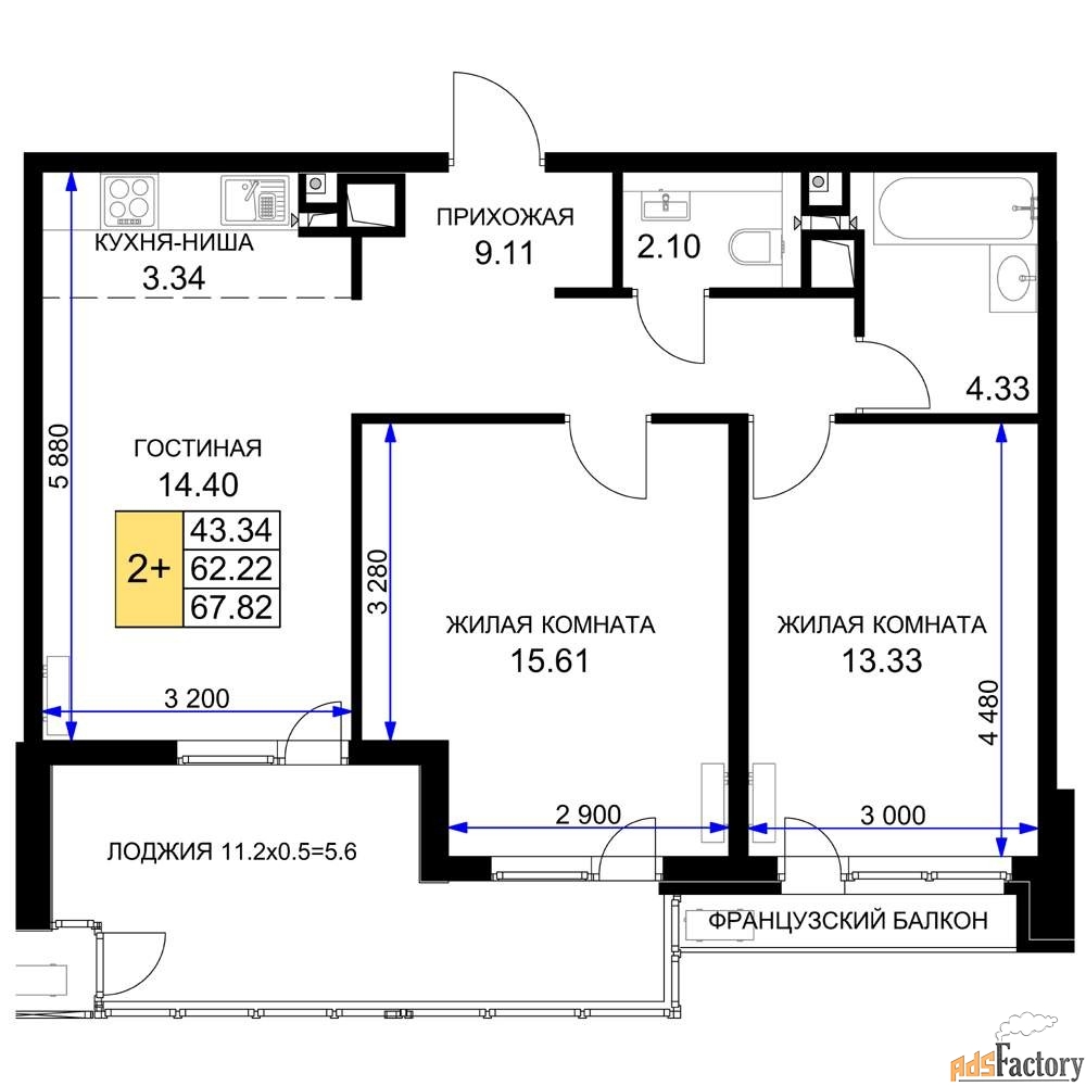 Жилая площадь 43.34 м2, кухня 17.74 м2, предчистовая отделка.