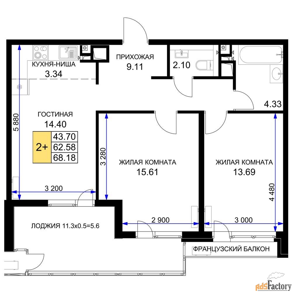 Жилая площадь 43.7 м2, кухня 17.74 м2, предчистовая отделка.