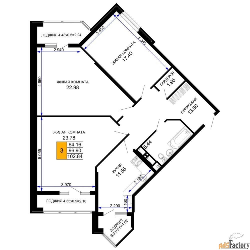 Жилая площадь 64.16 м2, кухня 11.55 м2, предчистовая отделка.