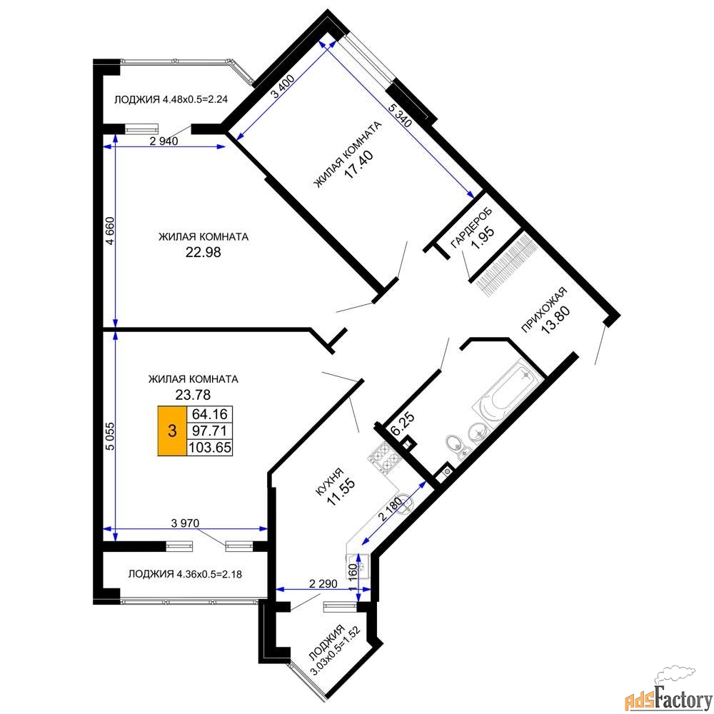 Жилая площадь 64.16 м2, кухня 11.55 м2, предчистовая отделка.