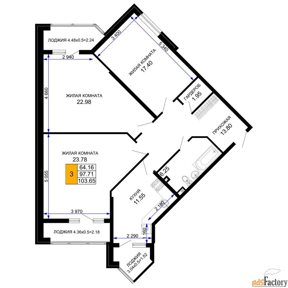 Жилая площадь 64.16 м2, кухня 11.55 м2, предчистовая отделка.