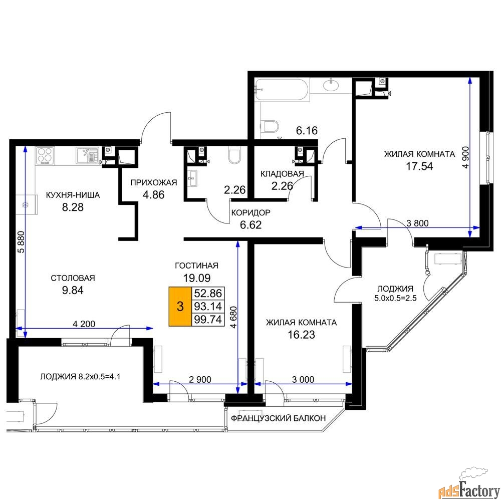 Жилая площадь 52.86 м2, кухня 18.12 м2, предчистовая отделка.