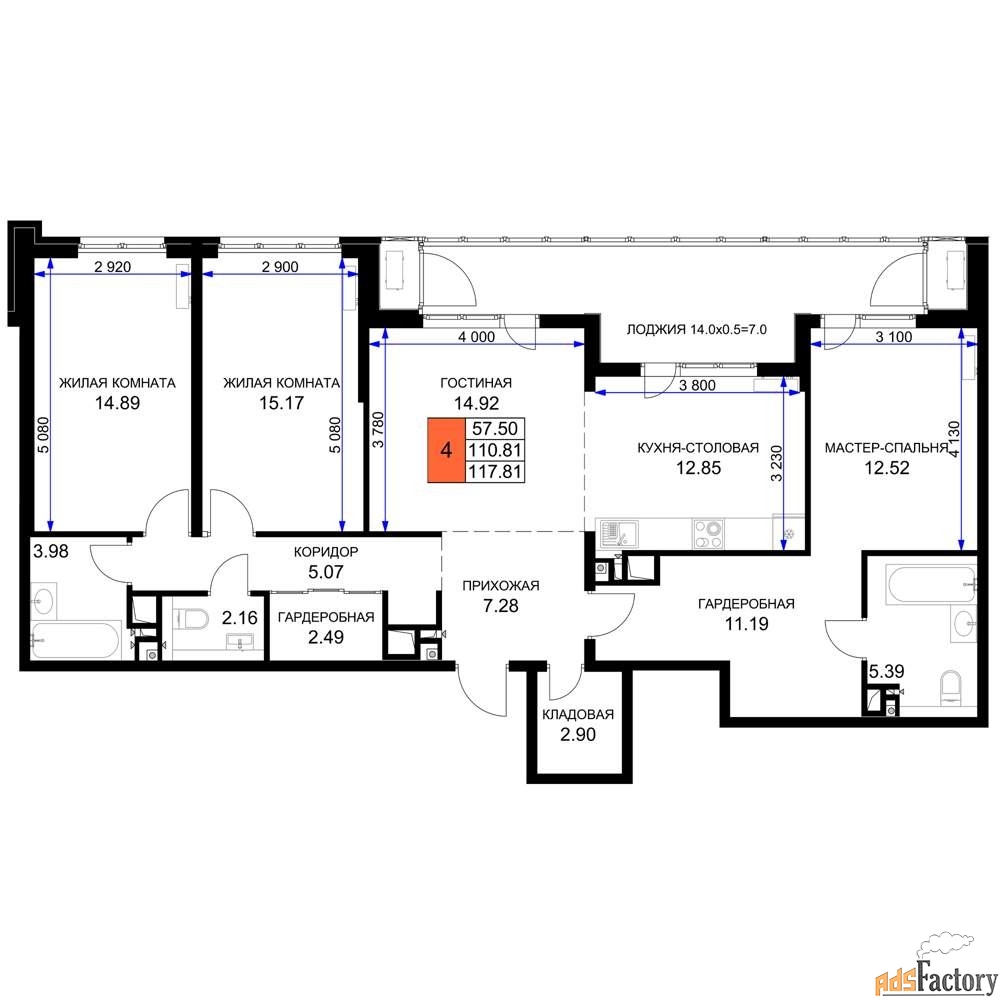 Жилая площадь 57.5 м2, кухня 12.85 м2, предчистовая отделка.