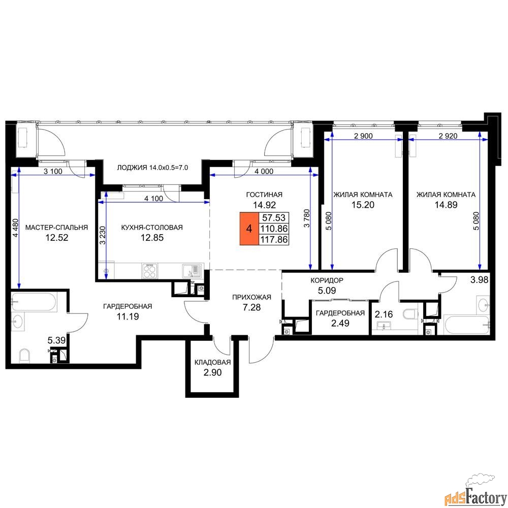 Жилая площадь 57.53 м2, кухня 12.85 м2, предчистовая отделка.