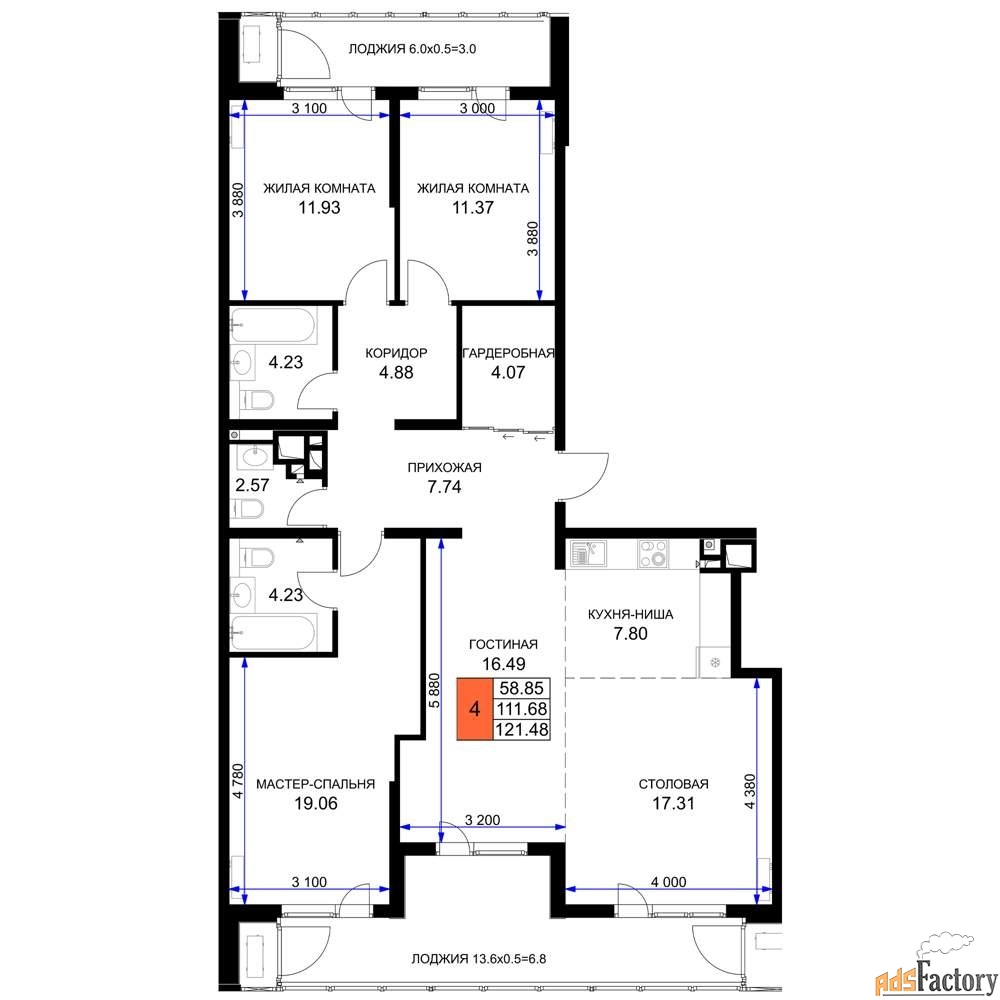 Жилая площадь 58.85 м2, кухня 25.11 м2, предчистовая отделка.