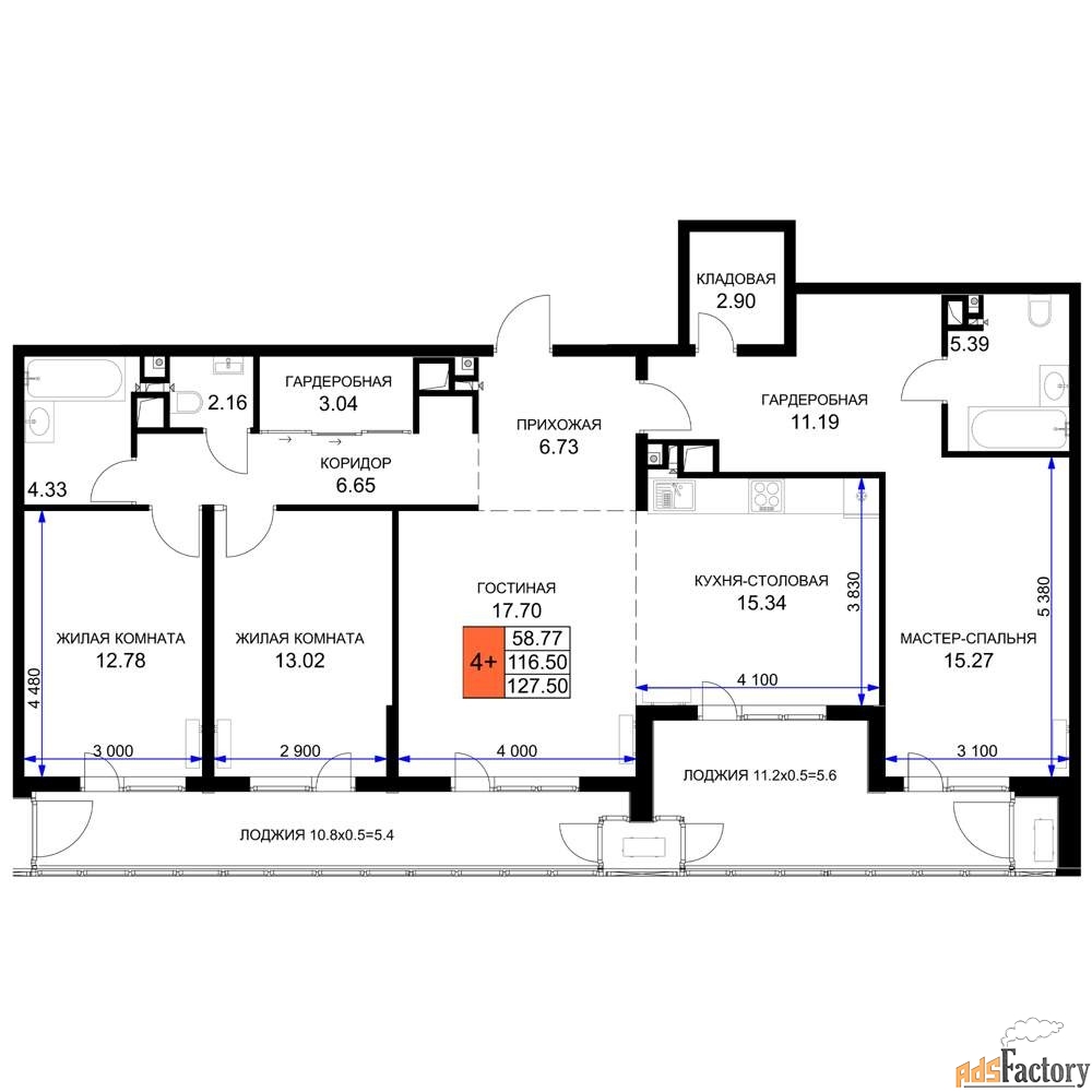 Жилая площадь 58.77 м2, кухня 15.34 м2, предчистовая отделка.