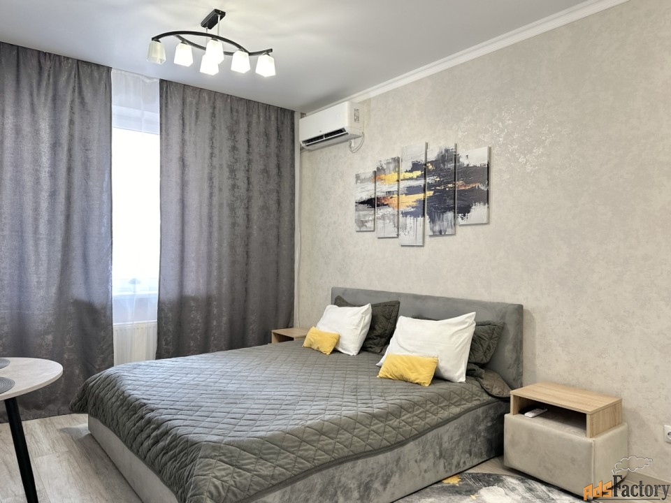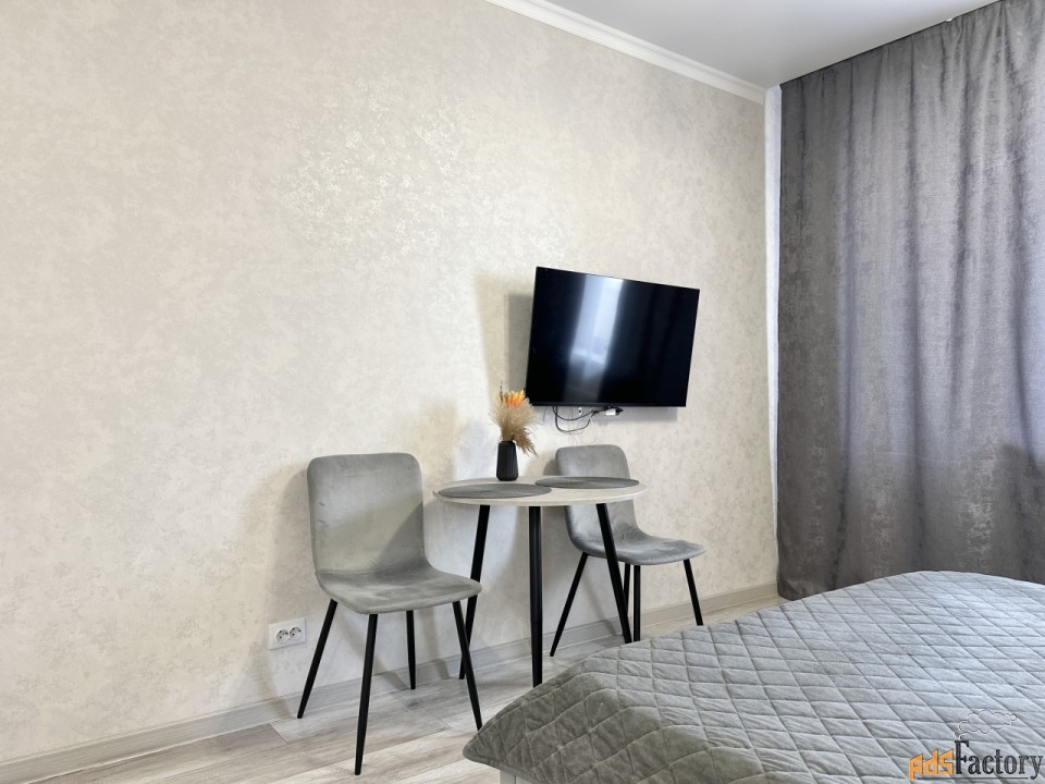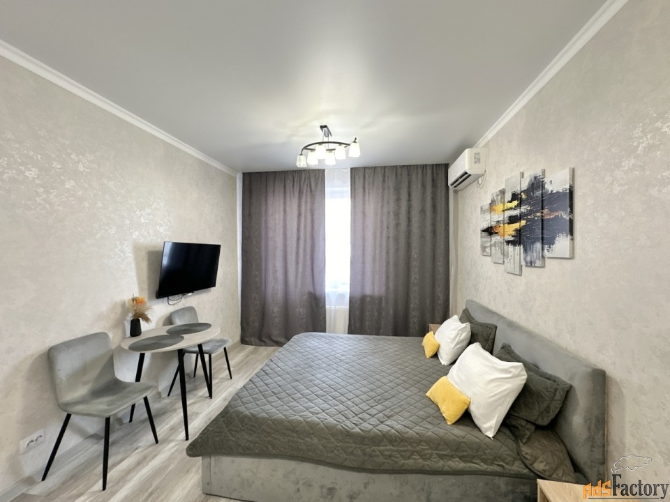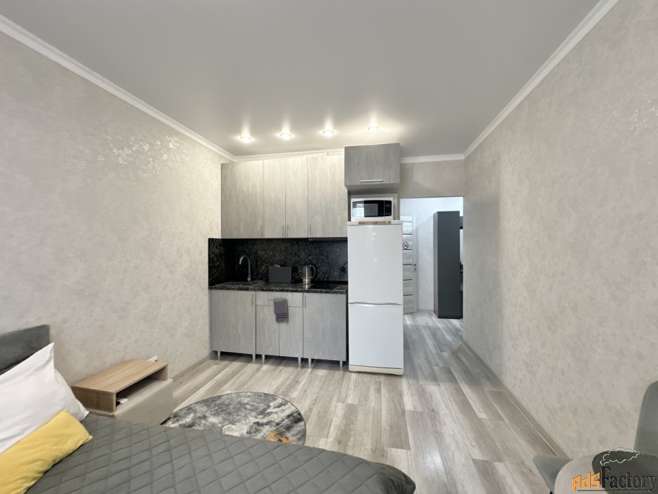 Продается уютная студия в современном жилом комплексе на улице Гидростроителей, ЖК Мелодия, Краснодар. Квартира расположена на 14 этаже 18-этажного монолитно-кирпичного дома, построенного в 2022 году. Общая площадь квартиры составляет 24 кв. м, жилая 14 кв. м. Высота потолков 2,7 метра, что добавляет ощущение простора. Из окон открывается вид во двор, обеспечивая тишину и спокойствие.