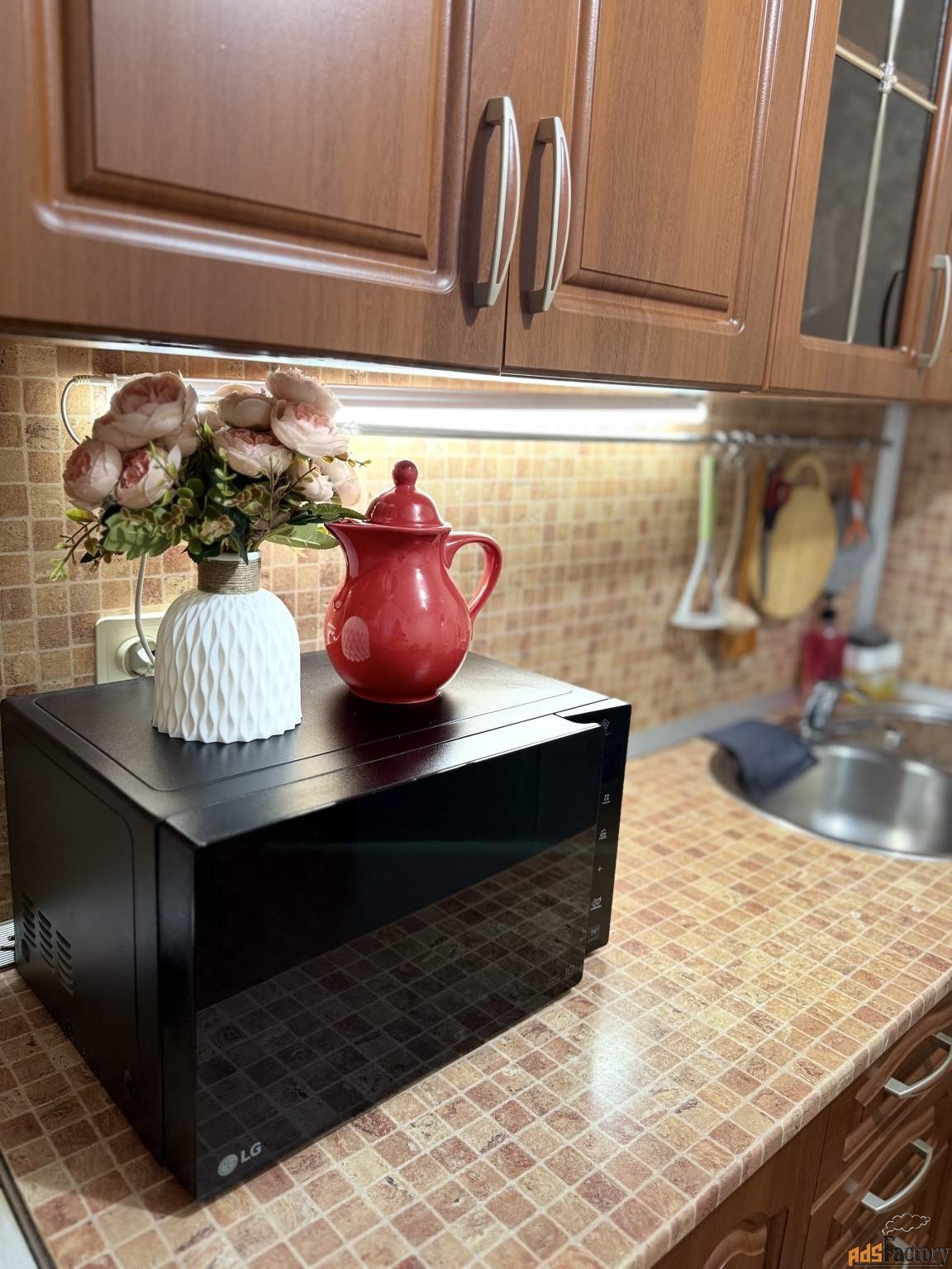 - Полностью укомплектованная кухня электрическая плита с духовкой, чайник, микроволновая печь, холодильник, посуда и столовые приборы