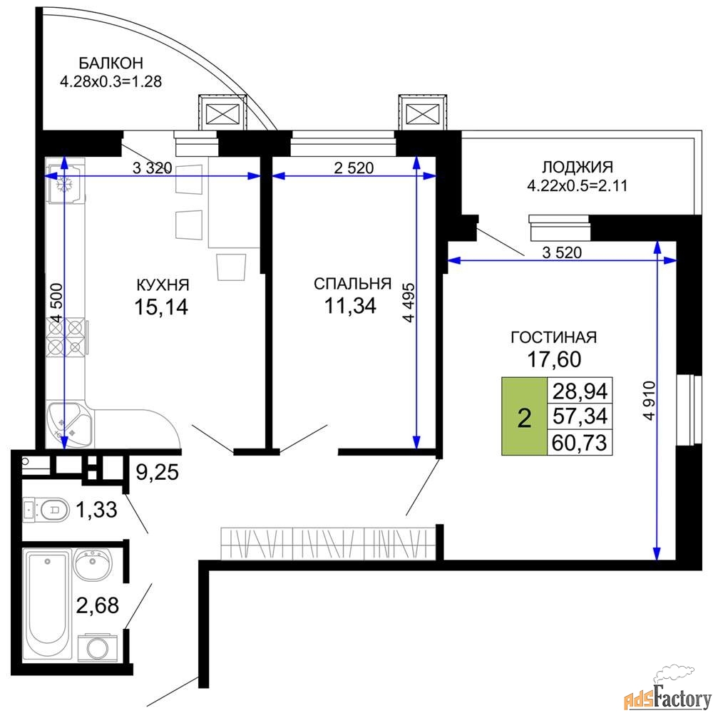 Жилая площадь 28.94 м2, кухня 15.14 м2, предчистовая отделка.