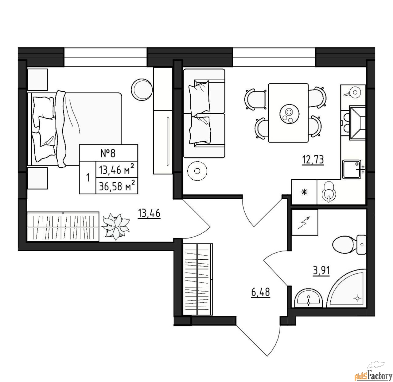 Жилая площадь 13.46 м2, кухня 12.73 м2, комнаты изолированные.
