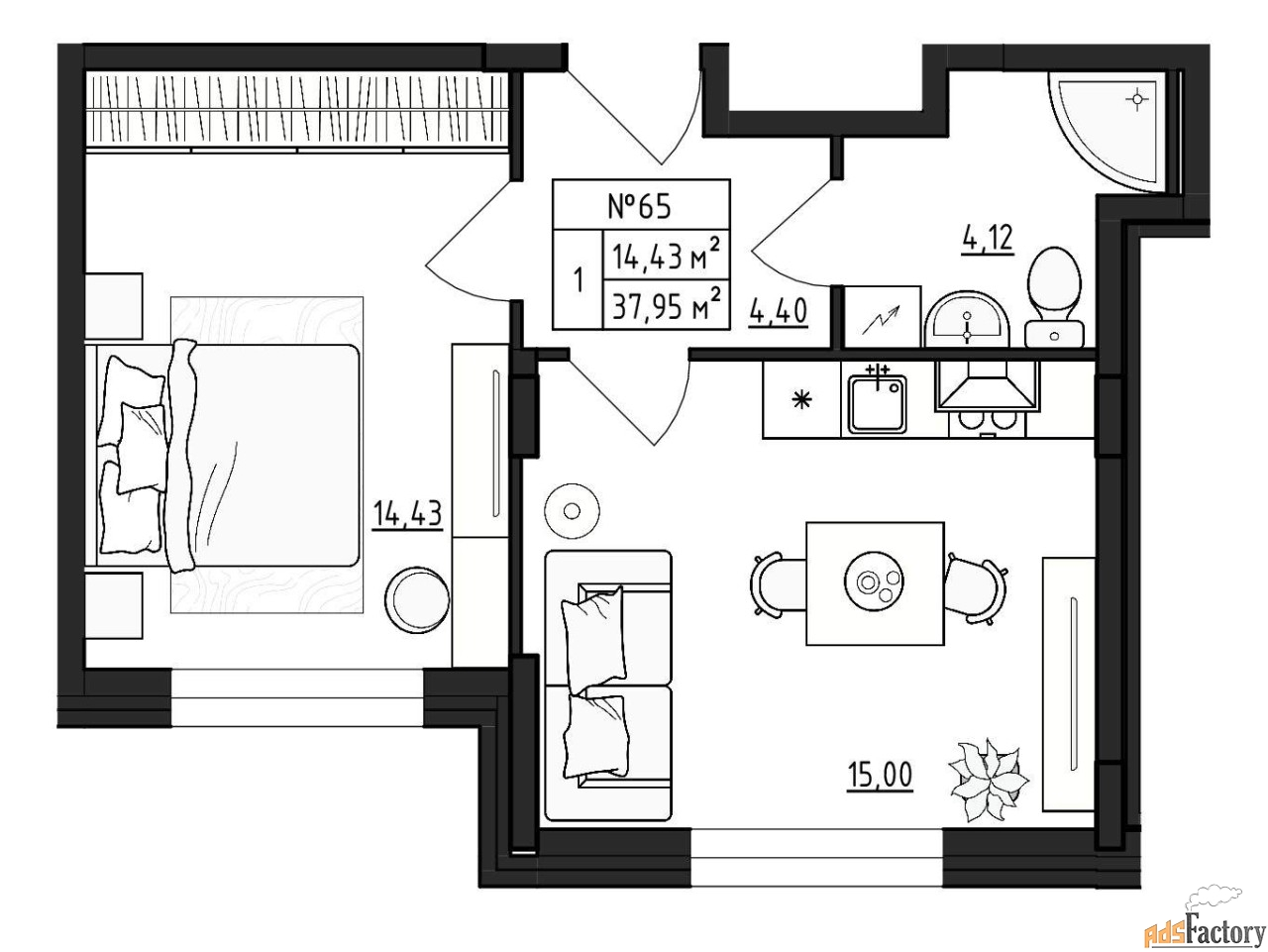 Жилая площадь 14.43 м2, кухня 15 м2, комнаты изолированные.