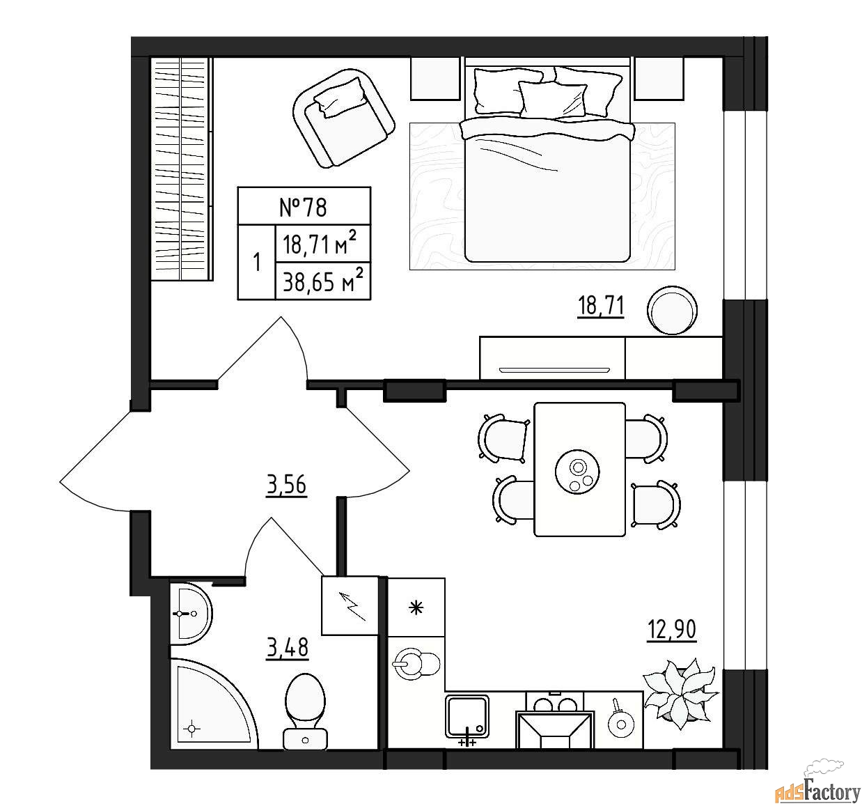 Жилая площадь 18.71 м2, кухня 12.9 м2, комнаты изолированные.
