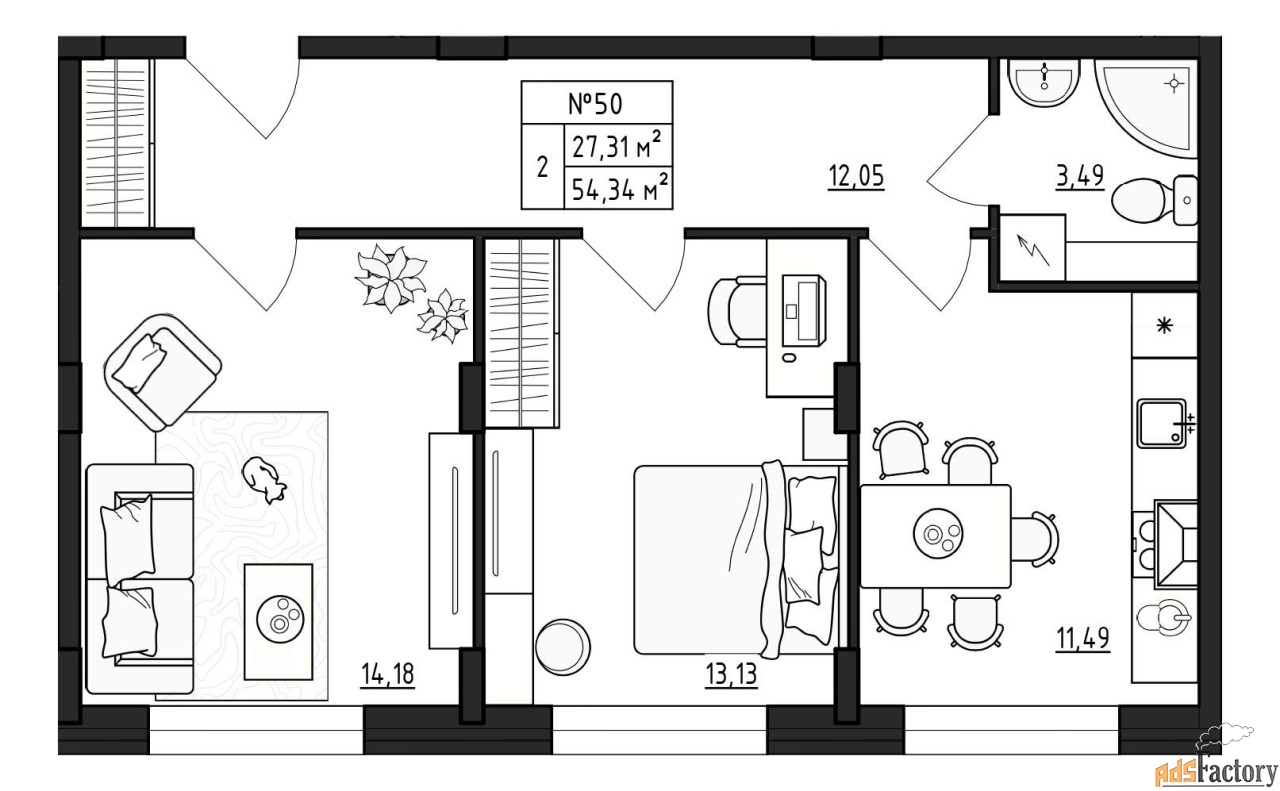 Жилая площадь 27.31 м2, кухня 11.49 м2, квартира без отделки.
