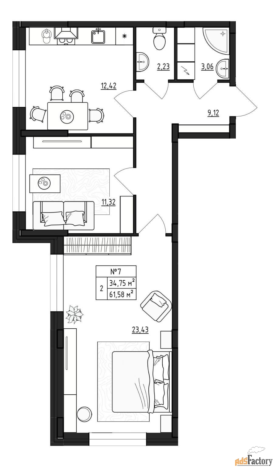 Жилая площадь 34.75 м2, кухня 12.42 м2, квартира без отделки.